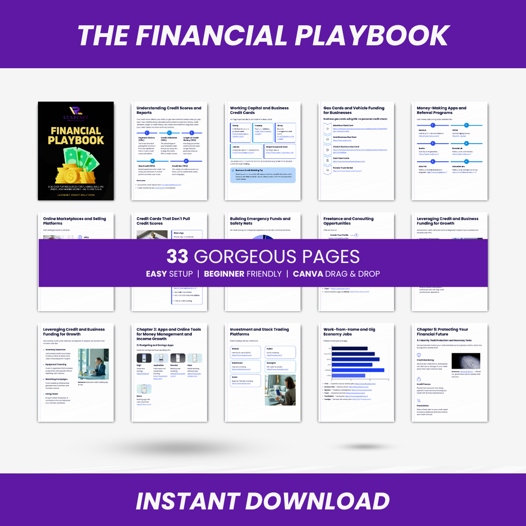 This is your all-in-one guide to funding, building credit, and growing your income. Designed for individuals with poor or fair credit, the Financial Playbook provides a curated list of the best apps, funding sources, and income opportunities to accelerate your journey toward financial stability and freedom.